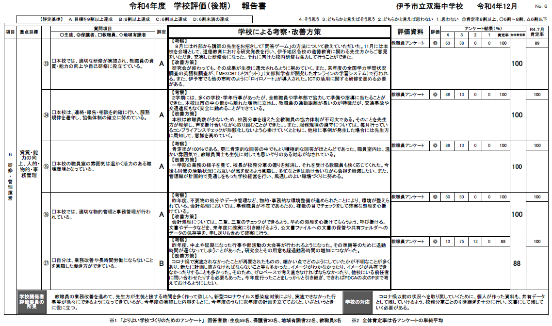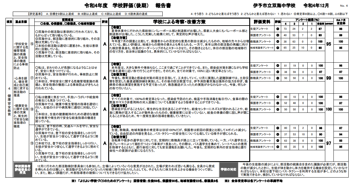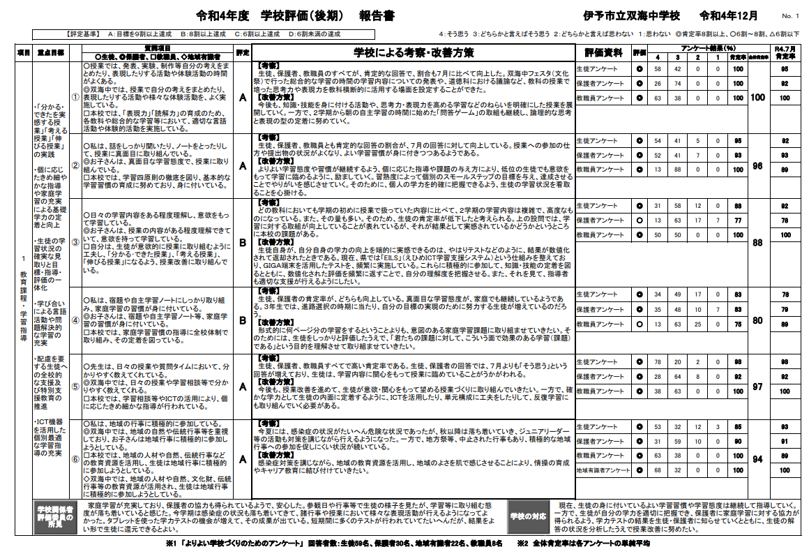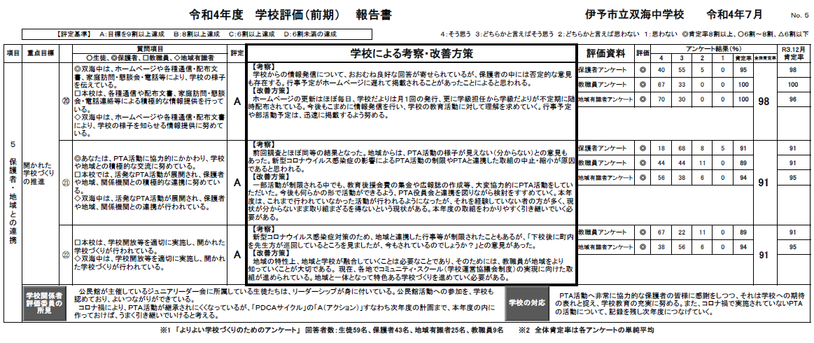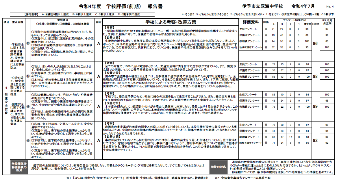 学校評価の結果と分析、学校評価委員の皆様のご意見を踏まえ、主な改善方策等、学校の対応を報告書にまとめております。