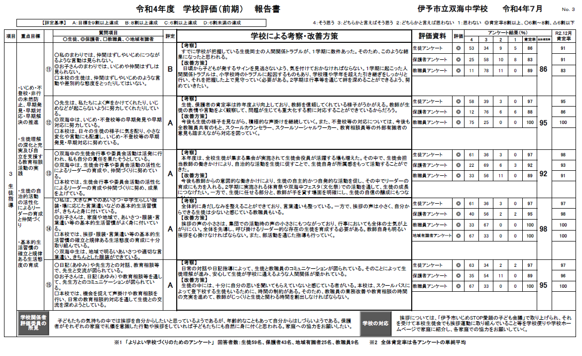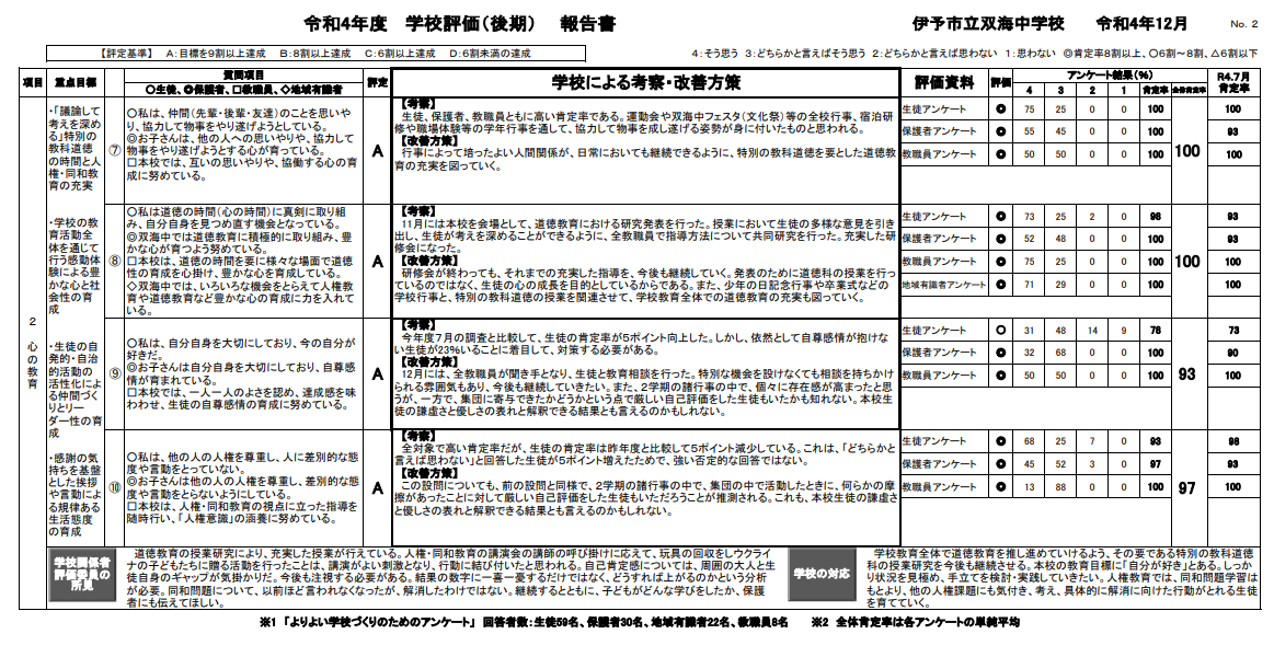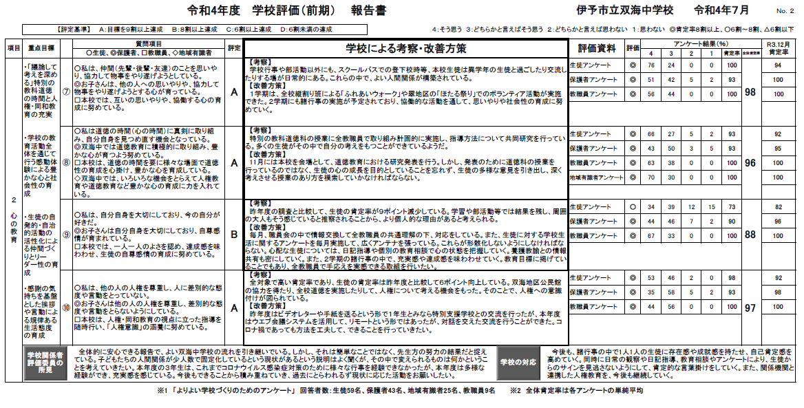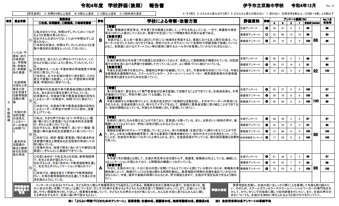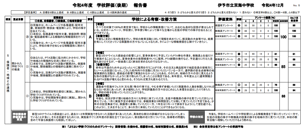 学校評価の結果と分析、学校評価委員の皆様のご意見を踏まえ、主な改善方策等、学校の対応を報告書にまとめております。